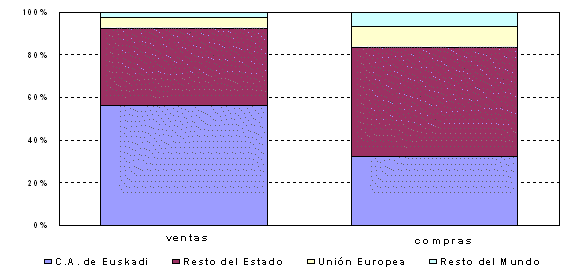 La distribución de las ventas realizadas a través de la red, según la localización de los clientes, da como resultado que, más de la mitad, en concreto el 56% del total facturado, tiene como destino el mercado interior de la C.A. de Euskadi, un 36% iría al resto del Estado, otro 5% se enviaría a la UE y el 3% restante al resto del mundo.