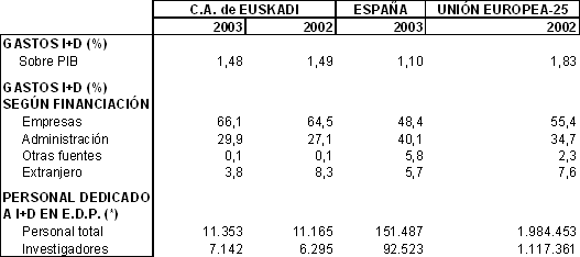 Se comprueba que existe una relación positiva entre el nivel del PIB por habitante y el porcentaje de PIB destinado a I+D. Los países más ricos son los que realizan una mayor inversión en I+D, esto es, los que superan el 2,5% de su PIB: Suecia, Japón, Finlandia, Alemania y EE.UU. Entre los que realizan un esfuerzo intermedio, entre el 1,5% y el 2,5% de su PIB, se encuentran Francia, Reino Unido, Noruega, Austria y Canadá. Las bajas inversiones en I+D se dan en Irlanda (1,15%), Italia (1,11%), España (1,10%), Hungría (1,02%), Portugal (0,93%) y Polonia (0,59%).