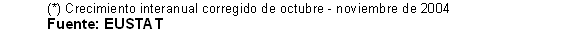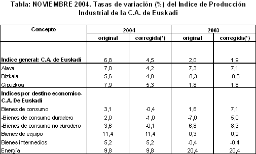 En el conjunto de los once primeros meses del año sobre el mismo período de 2003, las mayores tasas de crecimiento acumulado corresponden a "Energía eléctrica, gas y agua" (20,2%), "Refino de petróleo" (9,0%), "Material de transporte" (7,1%), "Material eléctrico" (7,0%) y "Maquinaria" (6,3%). Las tasas negativas afectan principalmente a los sectores de "Industria del cuero y calzado" (-13,4%), "Minerales metálicos y no metálicos" (-12,5%), "Industria no metálica" (-11,0%) y "Otras manufactureras" (-7,1%), entre otros.