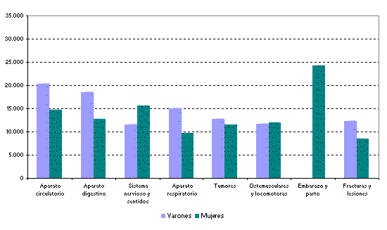 En comparación con el año 2002, el grupo de patologías relacionadas con las complicaciones de embarazo, parto y puerperio fue el que proporcionalmente experimentó un mayor crecimiento entre los grandes grupos de diagnósticos, con un 5,8% más de casos atendidos, hecho que, por otra parte, confirma el incremento del número de nacimientos que, para este mismo período, señala la Estadística de Nacimientos de Eustat. Entre las patologías más frecuentes de este grupo de diagnósticos, destaca el aumento de los casos de hospitalización por razones de embarazo prolongado, en un 33%, y de enfermedades de la madre que complican el embarazo (principalmente de anemia), en un 31,4%.