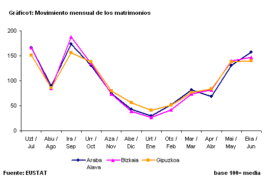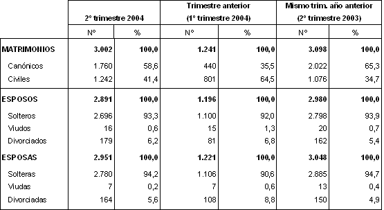 Respecto a la distribución de los matrimonios según la edad de los cónyuges, el 68,9% de los esposos tenía más de 30 años, mientras que entre las esposas este porcentaje supuso el 51,5%. Ambas proporciones son mayores que las obtenidas en el mismo trimestre de 2003, que fueron 65,9% y 45,1%, respectivamente.