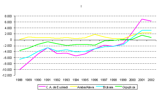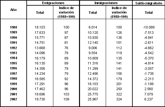 La tasa de emigración de la C.A. de Euskadi, que en 2002 fue del 9,4‰, si se excluyen los datos de emigraciones al extranjero se sitúa en el 9,1‰, algo más de tres puntos por debajo de la media del conjunto de comunidades autónomas. Situadas por encima de la media, Castilla-La Mancha, Madrid, La Rioja, Baleares y Ceuta-Melilla, superan a la C.A. de Euskadi con tasas que oscilan entre el 14‰ y el 37‰.