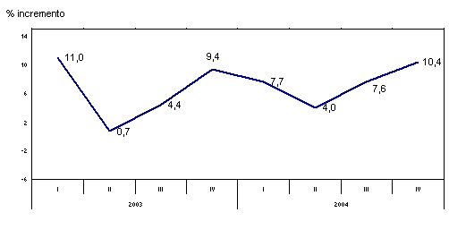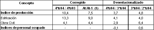 La actividad de la construcción de la C. A. de Euskadi en el cuarto trimestre de 2004 creció un 10,4% en términos nominales con respecto al mismo trimestre del año 2003, en términos homogéneos de calendario laboral, según datos elaborados por EUSTAT. La tasa acumulada de crecimiento para el conjunto del año 2004, con respecto al año anterior, alcanzó un crecimiento del 7,5%.