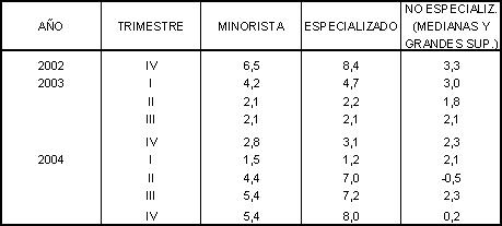 Por Territorios Históricos, el mayor crecimiento, en el cuarto trimestre de 2004, de las ventas nominales del sector minorista se ha producido en Bizkaia, con un aumento interanual del 9,3%, debido a un mayor crecimiento del comercio al por menor especializado (12,9%); le sigue Alava con una variación positiva del 6,1% del índice general minorista, mientras que Gipuzkoa obtiene un crecimiento algo más moderado, del 2,9%. En términos reales, los incrementos producidos son del 7,8% en Bizkaia, del 4,2% en Alava y del 2,0% en Gipuzkoa.