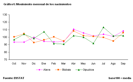 Los datos del tercer trimestre de 2004 de la Estadística de Nacimientos elaborada por EUSTAT dan una cifra de nacidos en la C.A. de Euskadi de 5.006, lo que supone un incremento del 3,8% respecto al mismo período del año anterior. Por territorios, en Álava nacieron 721 niños, con un crecimiento del 10,4%; en Gipuzkoa, con 1.797 nacimientos, el porcentaje de crecimiento se situó en el 4,7%, y Bizkaia experimentó el menor crecimiento, un 1,5%, con 2.488 nacimientos.