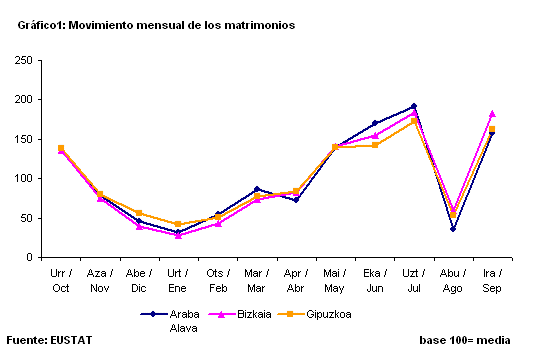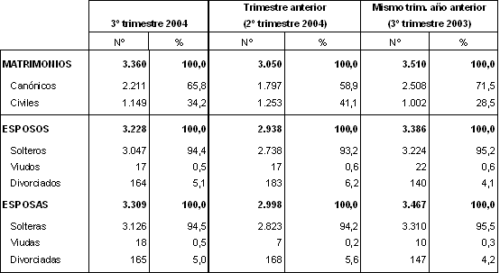 En los meses de julio, agosto y septiembre de 2004 se contabilizaron en la C.A. de Euskadi 3.360 matrimonios, lo que supone una disminución del 4,3% con respecto al mismo trimestre del año anterior, según datos de Eustat. Por territorios históricos, en todos ellos disminuyó el número de matrimonios respecto al tercer trimestre de 2003. Los vizcaínos celebraron 1.709 bodas, con una disminución del 3,7%; los guipuzcoanos, con 1.074 bodas, registraron un 1,1% menos y los alaveses, con 410, tuvieron una caída cifrada en el 15,1% respecto a igual período del año anterior. En el caso de residentes fuera de la C.A. de Euskadi, el número de bodas ascendió a 167.