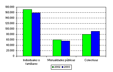 La modalidad de tipo individual o familiar, que agrupa al mayor número de asegurados (51,9%), fue la que acusó una mayor pérdida de asegurados (-7,1%), seguida de las de mutualidades públicas (-6,5%). Por el contrario, los seguros colectivos (dirigidos a empresas u otros colectivos concretos), que representan a un 29,7% de la población asegurada, registraron un crecimiento del 13,1%, continuando la evolución ascendente iniciada en el año 1999.