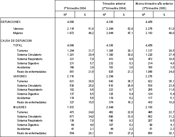 La principal causa de defunción la constituyeron los tumores: 1.294 personas fallecieron por ese motivo (31,7%); tras ella, como segunda causa de mortalidad, se encuentran las enfermedades del sistema circulatorio, que originaron 1.201 fallecimientos (29,4%). El tercer lugar lo ocuparon las enfermedades respiratorias, que en estos meses causaron 321 defunciones (7,9%).