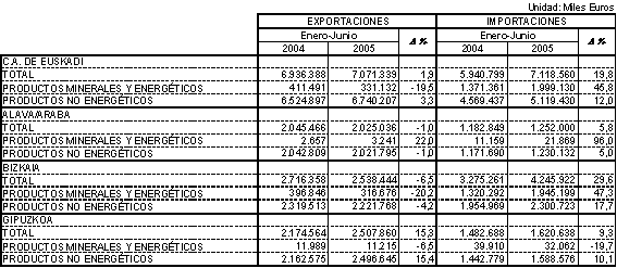 Las exportaciones a la Unión Europea-25 han registrado una subida del 5,1%, creciendo un 20,4% las que han ido a Italia, un 7,3% las de Alemania, un 3,8% las del Reino Unido, un 5,7% las de Portugal y un 30,9% las de Bélgica, por citar los países más relevantes. En cambio, han disminuido las que van a Francia (-0,2%), Países Bajos (-8,6%), Irlanda (-4,2%) y Polonia (-3,5%), entre otros. Las importaciones provenientes de la Unión Europea han tenido un crecimiento del 9,0% en el primer semestre de 2005, aumentando las de nuestros principales clientes/proveedores como Francia (0,8%), Alemania (6,5%), Italia (6,9%) y Reino Unido (5,5%).