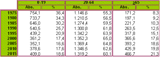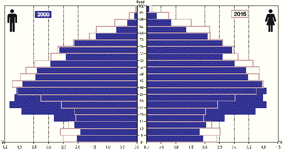 Sin embargo, esta evolución no es suficiente para contrarrestar el muy notable incremento de la población de 65 o más años: 101.000 personas más, lo que implica un incremento de su peso en la población total, que pasa de un 17,6% en 2000 a un 21,3% por ciento en 2015. Pero donde se produce el mayor incremento es en la proporción de personas de 85 o más años, ya que pasa de un 9,9% sobre la población total en 2000 a un 16,4% en 2015, como consecuencia de un mayor ritmo de crecimiento del segmento de población muy mayor (+5,14% anual) con respecto al conjunto de la población anciana (+1,64% anual). Este ritmo supone un incremento absoluto de más de 40.000 personas de 85 o más años, es decir, pasar de 36.100 a 76.600 personas en 15 años, lo cual es más que una duplicación en tan breve plazo de tiempo.