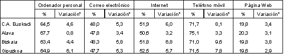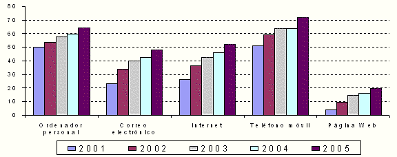 Así, mientras que los establecimientos con teléfono móvil aumentan en 8,1 puntos porcentuales hasta alcanzar al 71,7% del total, los que tienen acceso a Internet crecen en 6 puntos, siendo ahora más de la mitad, concretamente el 51,9%. Por su parte, tienen correo electrónico el 48%, al haber aumentado en 5,3 puntos porcentuales, y disponen de ordenador el 64,5% de los establecimientos, tras producirse asimismo un crecimiento de 4,6 puntos.