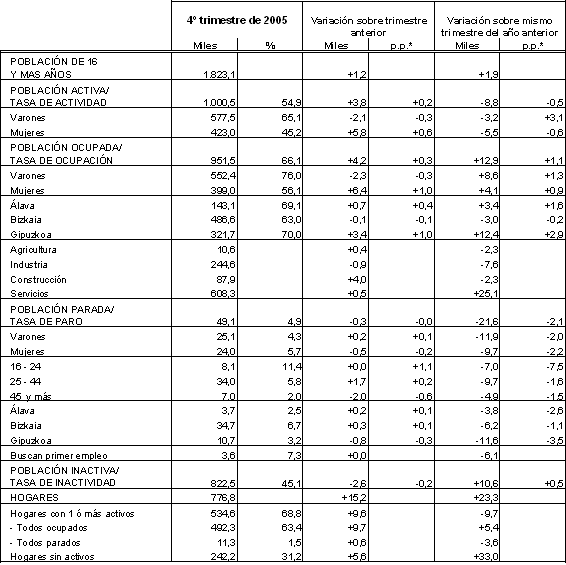 El número de parados, es decir, personas que están buscando empleo, hacen gestiones activas de búsqueda y además están disponibles para trabajar, se estima en 49.100 en este cuarto trimestre, 300 personas menos que hace tres meses. Por territorios históricos, en Gipuzkoa, con un total de 10.700, se produce un descenso de 800 personas, disminuyendo su tasa hasta el 3,2%. Por el contrario, en Álava se contabilizan 3.700 parados, 200 más que hace tres meses, quedando su tasa en el 2,5% y en Bizkaia se estiman 300 personas más en paro que hace tres meses, manteniendo la tasa más desfavorable de los tres territorios (6,7%).