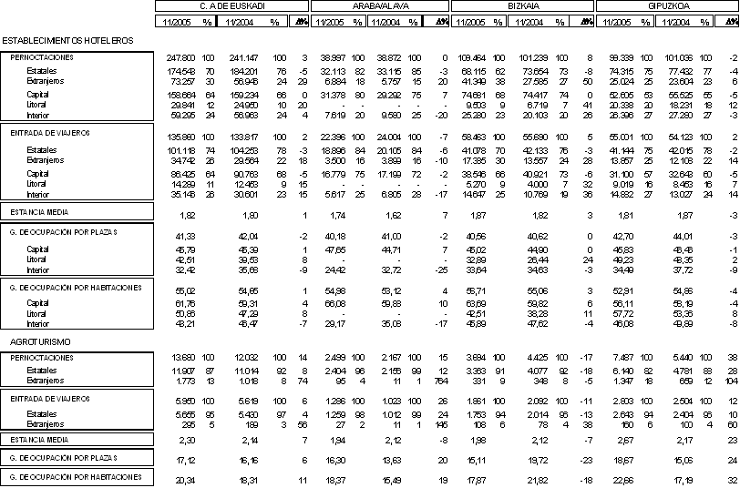 La duración de la estancia media ha experimentado una subida del 1% en el mes de noviembre de 2005 en el conjunto de la C. A. de Euskadi, pasando de 1,80 días del año anterior a 1,82 días de éste. La estancia media ha tenido una evolución positiva en el territorio de Álava, pasando de los 1,62 días anteriores a los 1,74 días actuales y en el de Bizkaia, pasando de 1,82 días a 1,87. En Guipúzcoa, en cambio, la duración de la estancia media desciende de 1,87 días a 1,81.