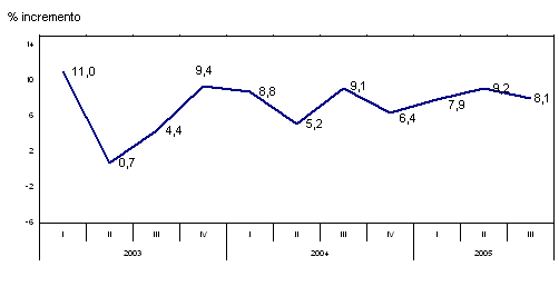 En el tercer trimestre de 2005, la actividad de la construcción en la C.A. de Euskadi experimentó un crecimiento nominal del 8,5% con respecto al mismo trimestre del año 2004, en términos homogéneos de calendario laboral, según datos elaborados por EUSTAT. En el conjunto de los nueve meses del año, el crecimiento ha sido del 7,9% sobre el mismo período del año anterior.