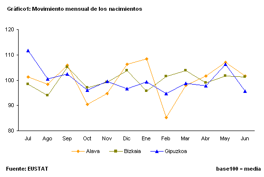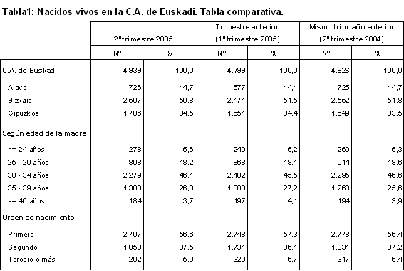 Según el orden de nacimiento, más de la mitad, 2.797 niños, han sido primeros hijos en el segundo trimestre de 2005; 1.850 niños (37,5%) llegan a familias en las que ya había otro hijo y alcanza el 5,9% el porcentaje de los hijos que son de orden tercero o posterior. Bizkaia (41,2 %) ha sido el único Territorio Histórico donde la proporción de segundos o posteriores hijos ha sido menor que la media de la C.A. de Euskadi, cifrada en un 43,4%. Por el contrario Álava y Gipuzkoa superan dicho porcentaje, suponiendo el 45,5% y 45,7% respectivamente.