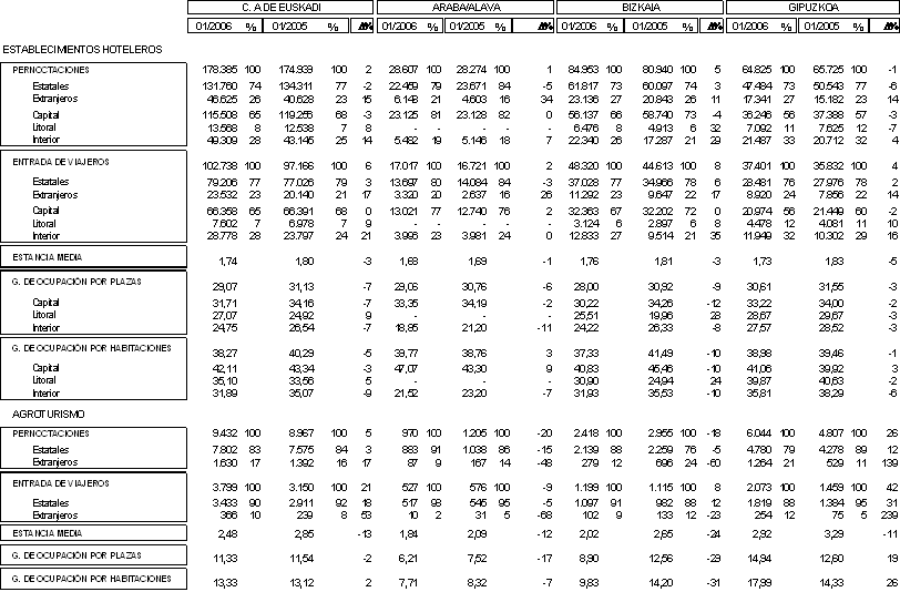 Las pernoctaciones registradas en enero de 2006 ascienden a 178.385, lo que representa un aumento del 2% sobre las del mes de enero del año anterior, es decir, casi 4.000 pernoctaciones más. Las pernoctaciones han tenido una evolución interanual positiva en Bizkaia y Álava, con crecimientos del 5% y 1%, respectivamente, mientras que en Gipuzkoa se produce un descenso en las pernoctaciones del 1%.