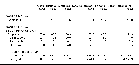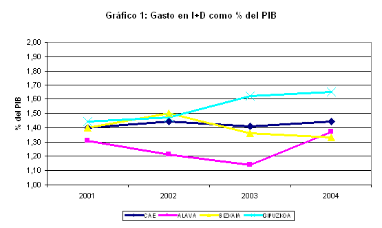 El esfuerzo realizado por Álava queda reflejado en la comparación del gasto en I+D como porcentaje del PIB, valor que para el conjunto de la C.A. de Euskadi se situó en el 1,44%. En efecto, en el año 2003 en Álava este indicador era del 1,14% y en 2004 ha pasado a representar el 1,37%, mientras que en Guipúzcoa se alcanzó el 1,65% y en Bizkaia el 1,33%, siendo en los tres territorios superior a la media española (1,07%).