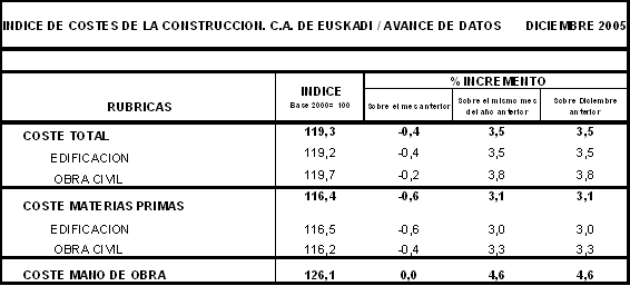 El Índice de Costes de la Construcción en la C.A. de Euskadi registró un descenso del 0,4% en el mes de diciembre de 2005 con respecto al mes anterior de noviembre, según datos facilitados por EUSTAT. La tasa del conjunto del año 2005 registra una subida del 3,5%, sobre el mes de diciembre de 2004.