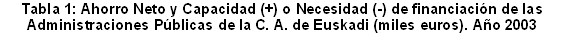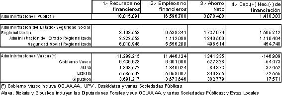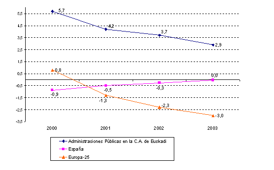 La comparación con el conjunto del Estado y con la Unión Europea muestra trayectorias diferenciadas. Las Administraciones Públicas en la C. A. de Euskadi, en su conjunto, presentan una trayectoria, aunque descendente, superavitaria en todo este período. Las Administraciones Públicas del conjunto del Estado han ido acercándose paulatinamente a la meta del déficit cero, conseguido en el año 2003. Las de Europa de los 25, sin embargo, muestran una trayectoria diametralmente opuesta a la anterior, ya que se está alejando del objetivo del déficit cero, año tras año, y en el 2003 se sitúa en un déficit del 3,0% del PIB.
