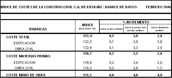 En el mes de febrero los mayores crecimientos de los precios se han producido en las materias primas consumidas de Energía eléctrica (3,9%), Cal, yeso y escayola (1,6%), Carpintería metálica (1,5%) y Aparatos y material eléctrico (0,7%), entre otros. En sentido contrario, han tenido una reducción en sus precios las materias primas de Derivados del petróleo (-0,8%), Productos asfálticos (-0,8%), Tubería de plástico (-0,7%) y Hierro y acero (-0,6%), entre otros.