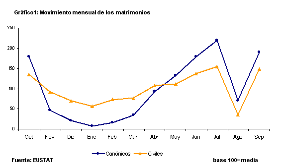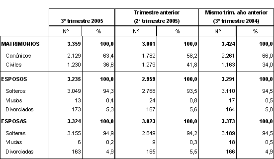 En los meses de julio, agosto y septiembre de 2005 se contabilizaron en la C.A. de Euskadi 3.359 matrimonios, lo que supone una disminución del 2% con respecto al mismo trimestre del año anterior. Los vizcaínos celebraron 1.754 bodas, con una disminución del 1%; los guipuzcoanos, con 1.043 bodas, registraron un 4% menos y sólo los alaveses, con 438, tuvieron un aumento cifrado en el 5% respecto a igual período del año anterior. En el caso de residentes fuera de la C.A. de Euskadi, el número de bodas ascendió a 138.
