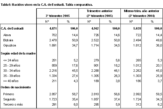 Los datos del tercer trimestre de 2005 de la Estadística de Nacimientos elaborada por EUSTAT dan una cifra de nacidos en la C.A. de Euskadi de 4.871, lo que supone una disminución del 3,1% respecto al mismo período del año anterior. Por territorios, en Álava nacieron 702 niños, con una disminución del 2,8%, y en Gipuzkoa, con 1.691 nacimientos, el porcentaje de decrecimiento se situó en el 6,7%. Por el contrario, Bizkaia se mantuvo en cifras parecidas al tercer trimestre de 2004, con 2.478 nacimientos (-0,6%).