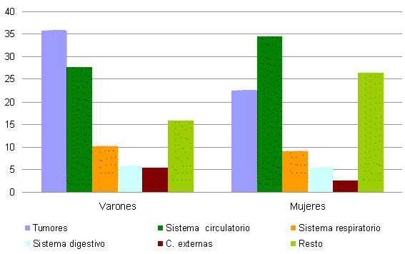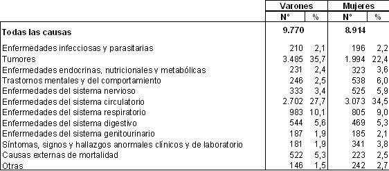 El 30,9% de las defunciones ocurridas en 2004, 5.775 muertes, se debieron a enfermedades del aparato circulatorio; a continuación se situaron los tumores, con un 29,3% (5.479 defunciones), y en tercer lugar, a mayor distancia, las enfermedades respiratorias, que supusieron el 9,6% (1.788).
