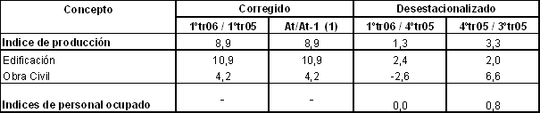 La evolución del sector de la construcción, en el primer trimestre de 2006, se ha sustentado más en el subsector de Edificación que en el de Obra Civil, alcanzando el primero una subida interanual del 10,9%, frente a un aumento del 4,2% obtenido por el segundo.