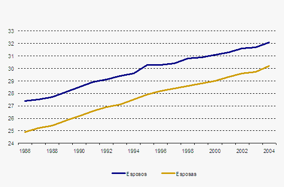 Paralelamente al aumento de la edad de la maternidad, se ha producido un aumento en la edad de los contrayentes. En 2004, la edad media de los varones solteros que contrajeron matrimonio fue de 32,1 años y de 30,2 la de las mujeres solteras. Desde 1986, la edad media de los esposos ha aumentado en 4,7 años y 5,3 en el caso de las esposas.