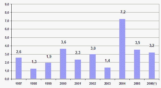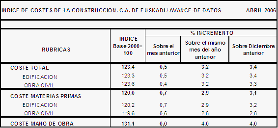 En el mes de abril los mayores crecimientos de los precios se han producido en las materias primas consumidas de Explosivos y gases (5,7%), Derivados del petróleo (4,9%), Productos asfálticos (4,9%), Hierro y acero (2,6%), Artículos de ferretería (1,6%) y Vidrio (1,4%), entre otros. En sentido contrario, han tenido una reducción en sus precios las materias primas de Energía eléctrica (-1,7%), Estructuras y calderería (-0,8%), Tubería metálica (-0,3%) y Áridos de extracción (-0,1%), entre otros.