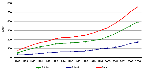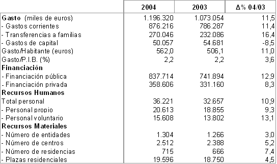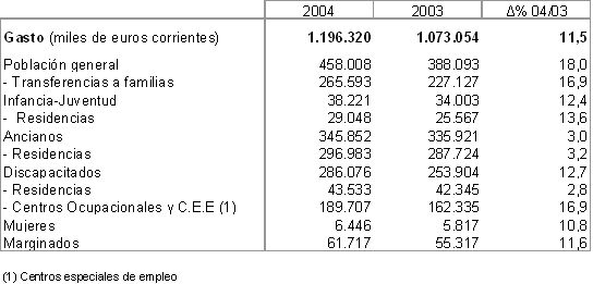 El gasto en servicios sociales en la C.A. de Euskadi alcanzó en 2004 la cifra de 1.196 millones de euros, un 11,5% más que el año anterior, lo que representó un 2,2% del PIB vasco, según datos de Eustat. El gasto medio por habitante se situó en 562 euros, de los que 393 procedieron de fondos públicos.