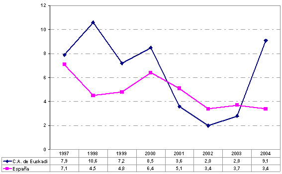 La evolución del sector industrial de la C.A. de Euskadi en el 2004 muestra un claro perfil de aceleración, con una tasa nominal anual del 9,1%, muy por encima de los discretos resultados obtenidos en el periodo de 2001 a 2003, según datos elaborados por EUSTAT. Este impulso de reactivación proviene de los sectores energéticos y siderúrgicos.