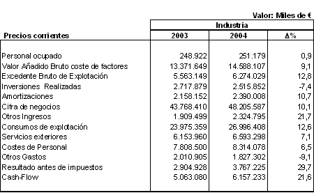 Los resultados antes de impuestos crecieron un 29,7% en 2004, sobresaliendo en este apartado los sectores de la Industria de la alimentación (67,4%), Metalurgia y artículos metálicos (52,4%) y Material de Trasporte (35,9%). Cuatro sectores (Industria de la madera, Otras manufacturas, Industria no metálica y Minerales metálicos y no metálicos) han reducido sus resultados antes de impuestos, en relación al año de 2003.