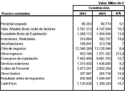 El sector de la construcción registró un crecimiento nominal del 10,3% y siguió marcando unas elevadas tasas de incremento de su valor añadido. Obtuvo una subida del 10,3% en el 2002, creció un 16,7% en el 2003 y volvió a crecer un 10,3 en el 2004.