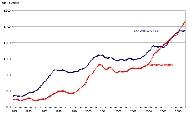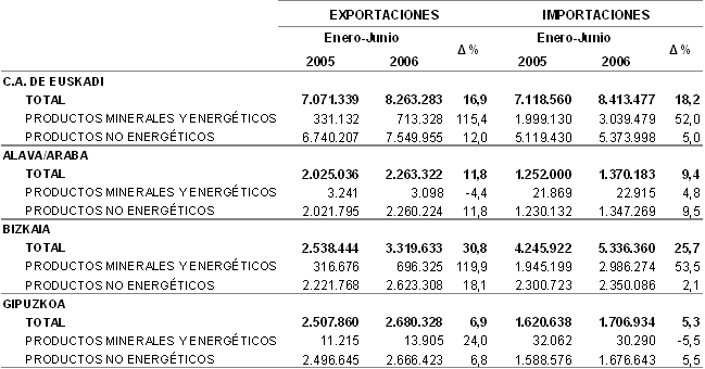 Las exportaciones con destino a la Unión Europea-25 han experimentado una subida del 11,2%, creciendo un 6,4% las que se dirigen a Francia (primer cliente en volumen), un 13,1% las de Alemania, un 24,8% las destinadas a Italia y un 2,4% las que han ido al Reino Unido, por citar los cuatro principales clientes de nuestras exportaciones en la Unión Europea. Por otra parte, las exportaciones destinadas a los Estados Unidos de América han registrado un fuerte incremento del 96,9% en este primer semestre. Las importaciones provenientes de la Unión Europea han incrementado su valor en un 8,4%, un 6,7% las que vienen de Alemania, un 6,5% las de Francia, un 3,8% las de Italia y disminuyen un 3,2% las del Reino Unido. Del resto de áreas económicas destacan como principales proveedores la Comunidad de Estados Independientes (CEI) con 1.264,1 millones, seguido de la Organización de Países Exportadores de Petróleo (OPEP) con 1.068 millones de euros.