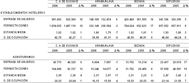 La duración de la estancia media por viajero ha pasado de 1,82 días del primer semestre del año anterior a 1,83 días de este primer semestre para el conjunto de la C.A. de Euskadi. Esta ligera mejoría proviene de Gipuzkoa (pasando de 1,86 días a 1,93), y en menor grado de Bizkaia, que pasa de 1,81 a 1,82, ya que este indicador se contrae en Alava de 1,79 días de un año antes a 1,66 de este primer semestre de 2006.