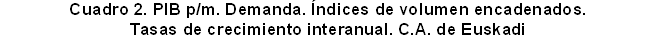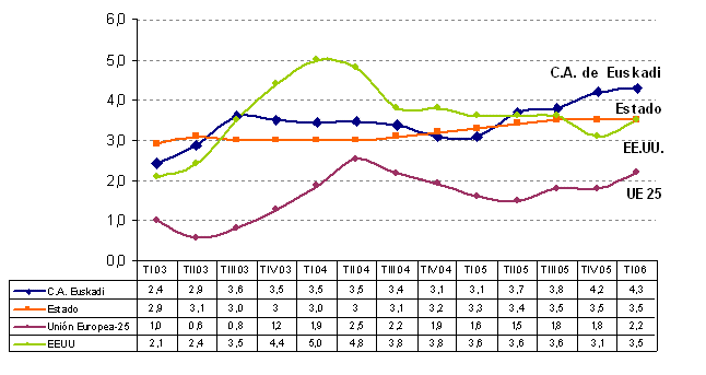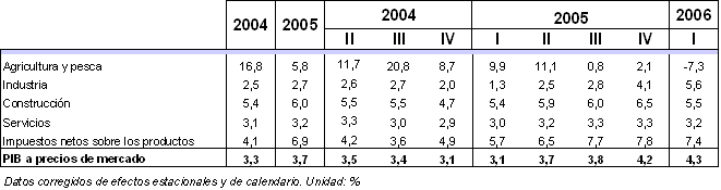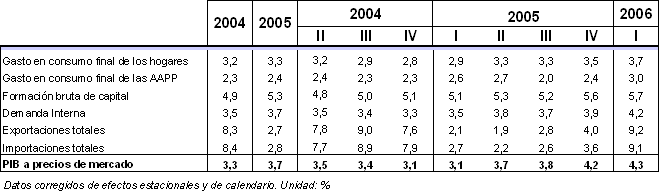 Desde la óptica de la Demanda, la demanda interna en este primer trimestre del año registra una tasa de crecimiento del 4,2% sobre el primer trimestre de 2005, acelerando su ritmo intertrimestral del 1,0% al 1,4%. Las exportaciones totales han cosechado un incremento interanual del 9,2% y las importaciones totales un crecimiento una décima menor, del 9,1%. Por lo tanto, se produce una aportación menos negativa del saldo exterior que hace un año. Hay que destacar dentro de este capítulo la fuerte recuperación observada en las exportaciones de bienes y servicios al extranjero, que de una tasa real de crecimiento del 4,5% del cuarto trimestre de 2005 ha pasado a una tasa del 14,7%.