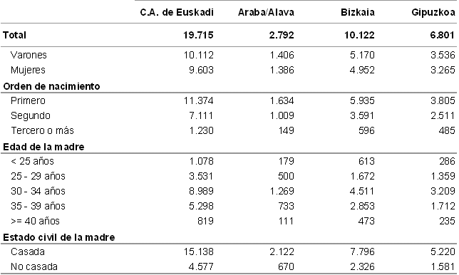 En 2005 el número de nacimientos en la C. A. de Euskadi alcanzó la cifra de 19.715, lo que supuso un aumento del 0,6% respecto a 2004; este crecimiento fue menor al experimentado entre 2003 y 2004, que se cifró en el 1,7%. En Bizkaia, en 2005, se produjo el mayor ascenso (1,3%), seguido de Gipuzkoa (0,2%), mientras que Álava registró un descenso del 0,6%.