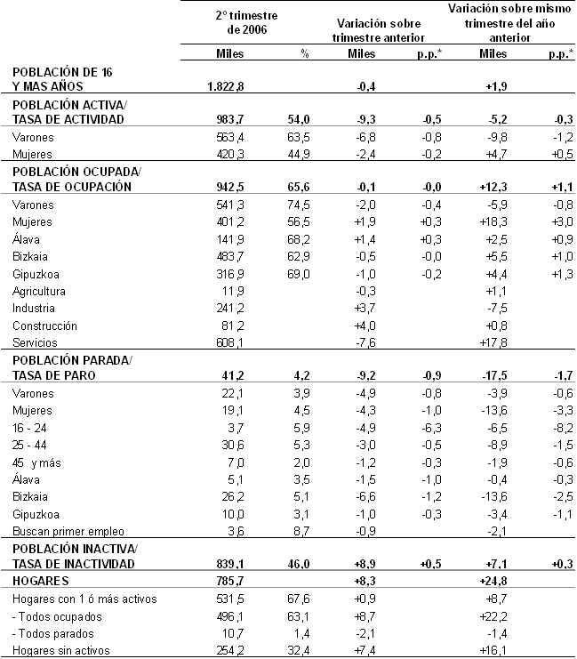 El número de parados, es decir, personas que están buscando empleo, hacen gestiones activas de búsqueda y además están disponibles para trabajar, se estima en 41.200 en este segundo trimestre, 9.200 personas menos que hace tres meses. Por territorios históricos, en Álava, con un total de 5.100, se produce un descenso de 1.500 personas, bajando su tasa hasta el 3,5%, en Bizkaia se contabilizan 26.200 parados, 6.600 menos que hace tres meses, pero manteniendo todavía la tasa menos favorable (5,1%) y, en Gipuzkoa se estiman 1.000 personas menos en paro que hace tres meses y con la tasa más favorable de los tres territorios (3,1%).