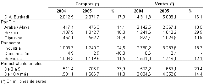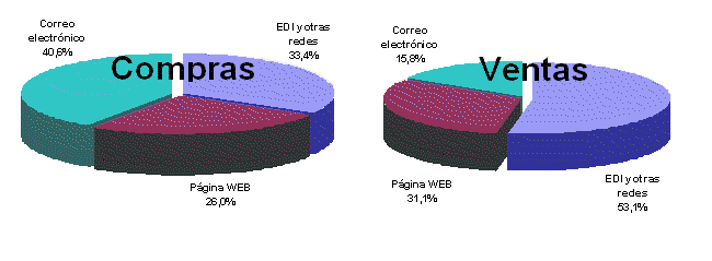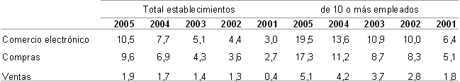 Además, si se tiene en cuenta el tamaño, entre las empresas de 10 o más empleados, el 19,5% efectúan comercio electrónico, tras un importante crecimiento en 2005 de 5,9 puntos porcentuales. También en este segmento, el incremento viene originado básicamente por los que efectúan compras electrónicas, que suponen el 17,3% y que han crecido 6,1 puntos respecto al año anterior y, aunque con menos peso, por los que realizan ventas por las mismas vías, que son el 5,1%, después de aumentar 0,9 puntos.