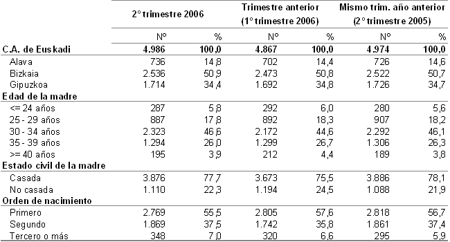 Según el orden de nacimiento, más de la mitad, 2.769 niños, han sido primeros hijos en el segundo trimestre de 2006; 1.869 niños (37,5%) llegan a familias en las que ya había otro hijo y alcanza el 7% el porcentaje de los hijos que son de orden tercero o posterior. Bizkaia (42,2 %) ha sido el único Territorio Histórico donde la proporción de segundos o posteriores hijos ha sido menor que la media de la C.A. de Euskadi, cifrada en un 44,5%. Por el contrario Álava y Gipuzkoa superan dicho porcentaje, suponiendo el 45,7% y 47,3% respectivamente.