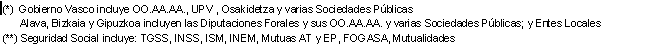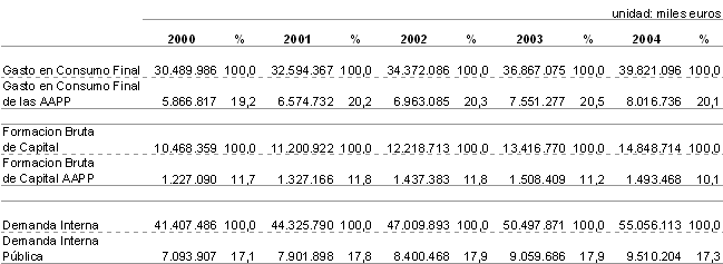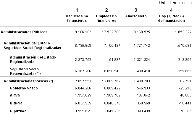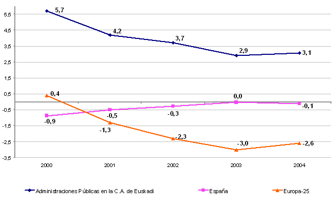 Las Administraciones Públicas en la C. A. de Euskadi (Administraciones Vascas y Administración del Estado y Seguridad Social regionalizadas) en 2004 anotaron un superávit de 1.653 millones de euros en términos de capacidad de financiación, un 3,1% del PIB, según datos elaborados por EUSTAT. En el período de 2000 a 2003 este ratio fue contrayéndose, desde el 5,7% de 2000 hasta el 2,9% de 2003, para remontar dos décimas en 2004.