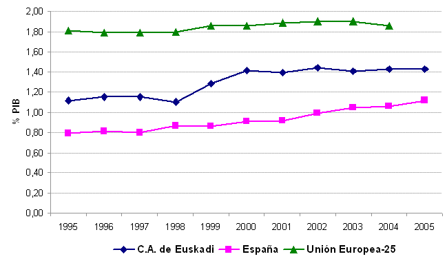 Se comprueba que existe una relación positiva entre el nivel del PIB por habitante y el porcentaje de PIB destinado a I+D. Los países más ricos son los que realizan una mayor inversión en I+D, esto es, los que superan el 2,5% de su PIB: Suecia, Finlandia, Japón, Islandia, Suiza, EE.UU y Alemania. Entre los que realizan un esfuerzo intermedio, del 1,5% al 2,5% de su PIB, se encuentran Dinamarca, Austria, Francia, Bélgica, Reino Unido, Holanda, Luxemburgo y Noruega. Las menores inversiones en I+D se dan en Irlanda (1,20%), Italia (1,11%), España (1,12%), Hungría (0,89%), Portugal (0,74%) y Polonia (0,56%).