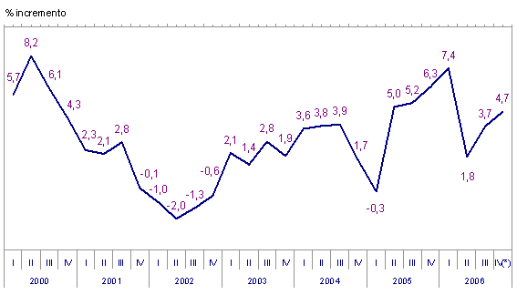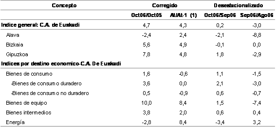 Sectorialmente, teniendo en cuenta la clasificación de los grandes sectores industriales, la evolución del índice de octubre de 2006 respecto a octubre de 2005 presenta variaciones de distinto signo en ellos: los Bienes de equipo crecen un 10,0%; los Bienes intermedios suben un 3,8%, los Bienes de consumo aumentan un 1,6%, como consecuencia de los ascensos experimentados por los Bienes de consumo duradero (3,6%) y los Bienes de consumo no duradero (0,5%), pero la Energía disminuye un 2,8%.
