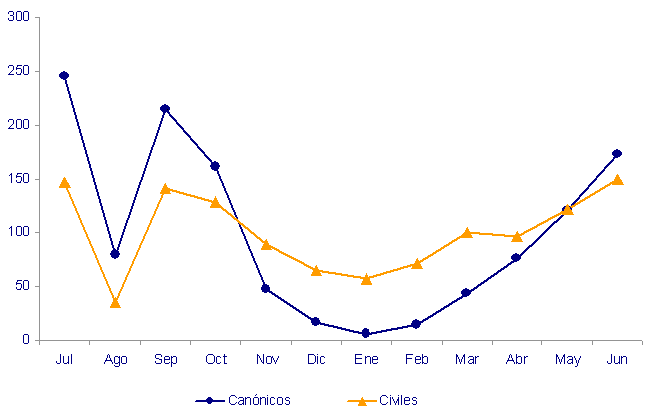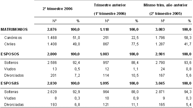 Respecto a la distribución de los matrimonios según la edad de los cónyuges, el 73,6% de los esposos tenía más de 30 años, mientras que entre las esposas este porcentaje supuso el 56,4%. Estas proporciones son mayores que las que se dieron en el mismo trimestre de 2005 (68,9% y 49,2%, respectivamente) lo que mantiene, un trimestre más, la tendencia al alza en la edad de contraer matrimonio de la población.