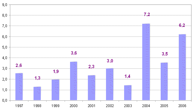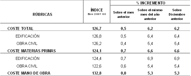 Entre los precios de las materias primas consumidas por el sector que han experimentado mayores tasas de inflación a lo largo de 2006 figuran: Energía eléctrica (24,8%), Hierro y acero (22,0%), Tubería metálica (17,3%) y Vidrio (12,8%). En sentido contrario, han registrado reducciones en sus precios anuales (diciembre de 2006 sobre diciembre de 2005), las materias primas de Derivados del petróleo(-4,8%), Productos asfálticos (-2,7%) y Productos cerámicos (-0,1%).