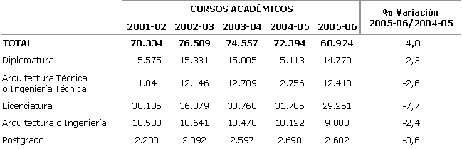 Las titulaciones más solicitadas fueron: Ingeniería Técnica Industrial (6.857), Magisterio (5.623), Administración y Dirección de Empresas (5.476), Diplomatura en Ciencias Empresariales (3.966) e Ingeniería Industrial (3.184). Las inscripciones en estas cinco carreras representaron, en este curso académico, el 40% de las matriculaciones. En cuanto a la elección por parte de las mujeres cabe señalar: Magisterio (4.263), Administración y Dirección de Empresas (3.160), Psicología (2.170), Diploma en Ciencias Empresariales (2.080) y Derecho (1.760), entre las más solicitadas.