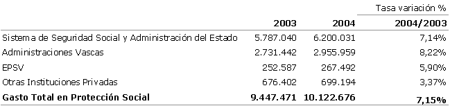 La comparación de estos resultados con los del conjunto del Estado ofrece un análisis dispar. Por una parte, el gasto total en prestaciones sociales por habitante en la C. A. de Euskadi, que era superior en un 9% al del Estado en 1995, llegó a superarlo en un 22% en 2004. Por otra parte, si se mide el esfuerzo en protección social en proporción al PIB en 2004, en la C.A. de Euskadi se destinó a gastos totales en protección social de sus habitantes el 18,9%, mientras que en el Estado alcanzó el19,5% .