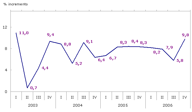 La evolución del sector de la construcción, en el cuarto trimestre de 2006, se ha sustentado más en el subsector de Edificación que en el de Obra Civil, alcanzando el primero una subida interanual del 10,2%, frente a un aumento del 8,9% obtenido por el segundo. En términos acumulados se mantienen las posiciones, con un crecimiento del 8,5% para Edificación en el conjunto del año y del 6,8% para Obra Civil.