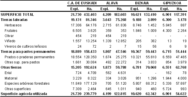 El número de explotaciones en la C.A. de Euskadi ha pasado de 22.234 en 2003 a 21.730 en 2005, un 2,3% menos. Tanto la superficie agraria total como la superficie agrícola utilizada (tierras labradas y tierras para pastos permanentes) apenas han sufrido variación con respecto a 2003, un 0,5% más la primera y un 0,5% menos la segunda, según datos elaborados por Eustat.